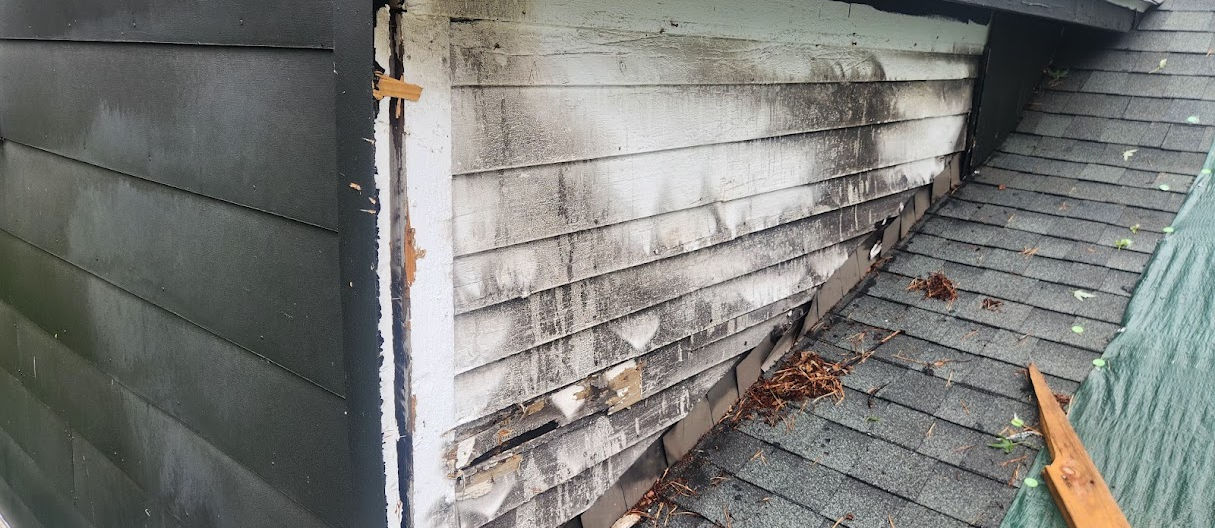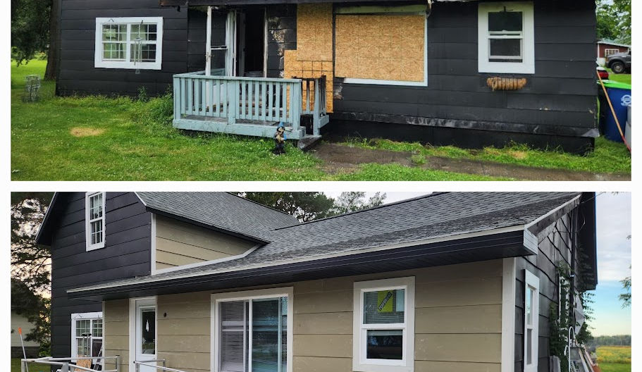 This customer had fire damage to exterior and interior. For the exterior we replaced sheeting, ice guard, and shingles. We replaced the front door and window that were damaged. Siding was replaced and painted to match existing siding. For the interior we hung drywall, painted, replaced flooring, cleaned any surface that didn't need replaced but had remnants of smoke.